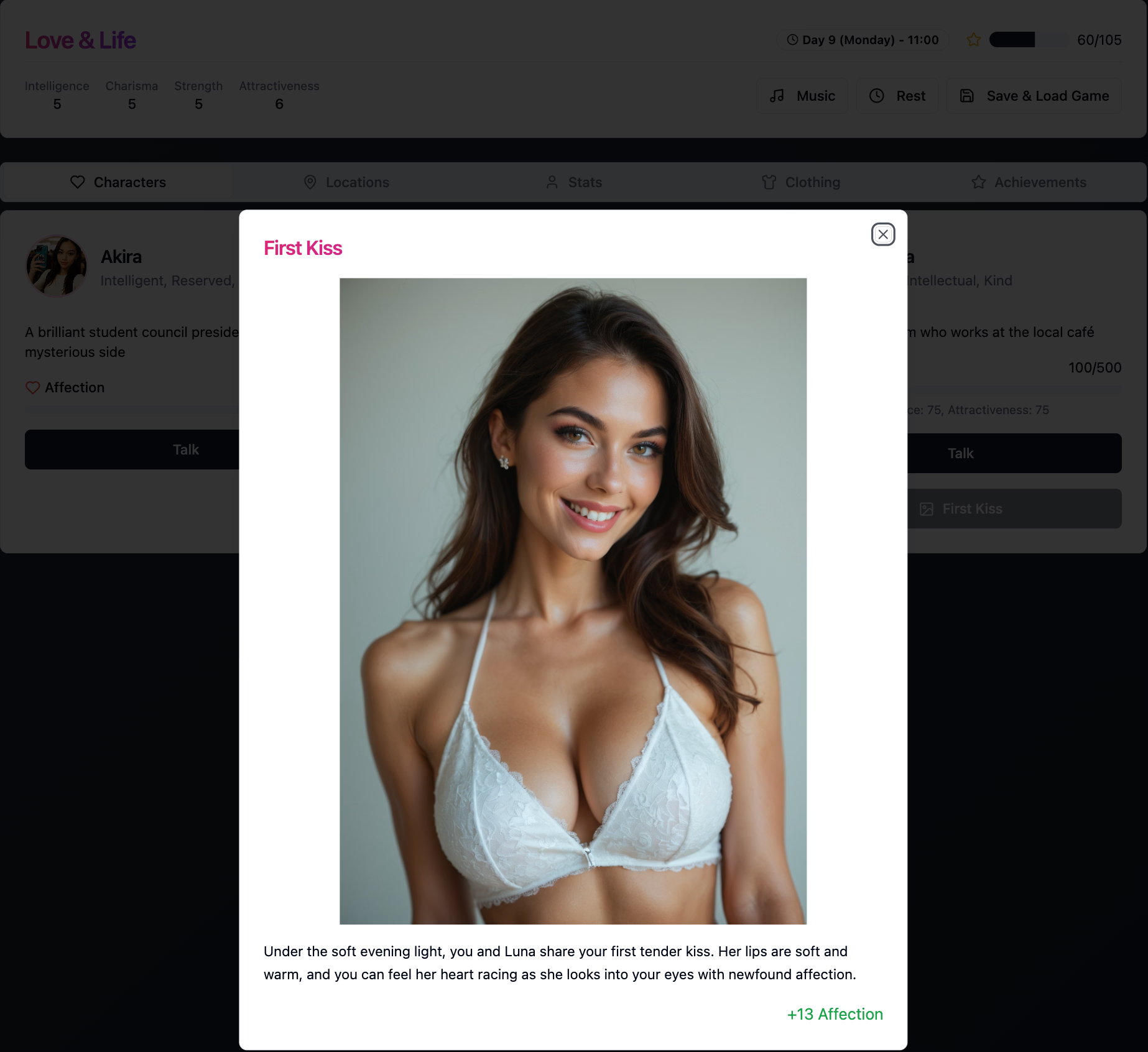 2. Romance & Intimacy System: Build trust through heartfelt conversations, spontaneous encounters, and skill-based training to unlock passionate endings.