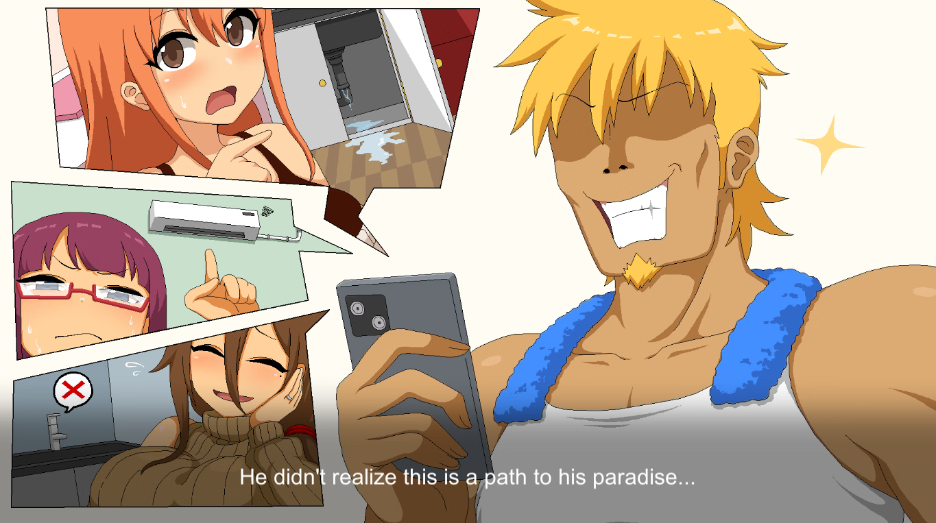 1. Follow the protagonist’s dramatic shift from corporate playboy to self-reliant handyman, navigating moral choices and emotional growth.2. Explore a vibrant, eccentric town where every job—whether fixing pipes or solving local mysteries—reveals fragments of a mysterious "paradise" hinted at throughout the game.